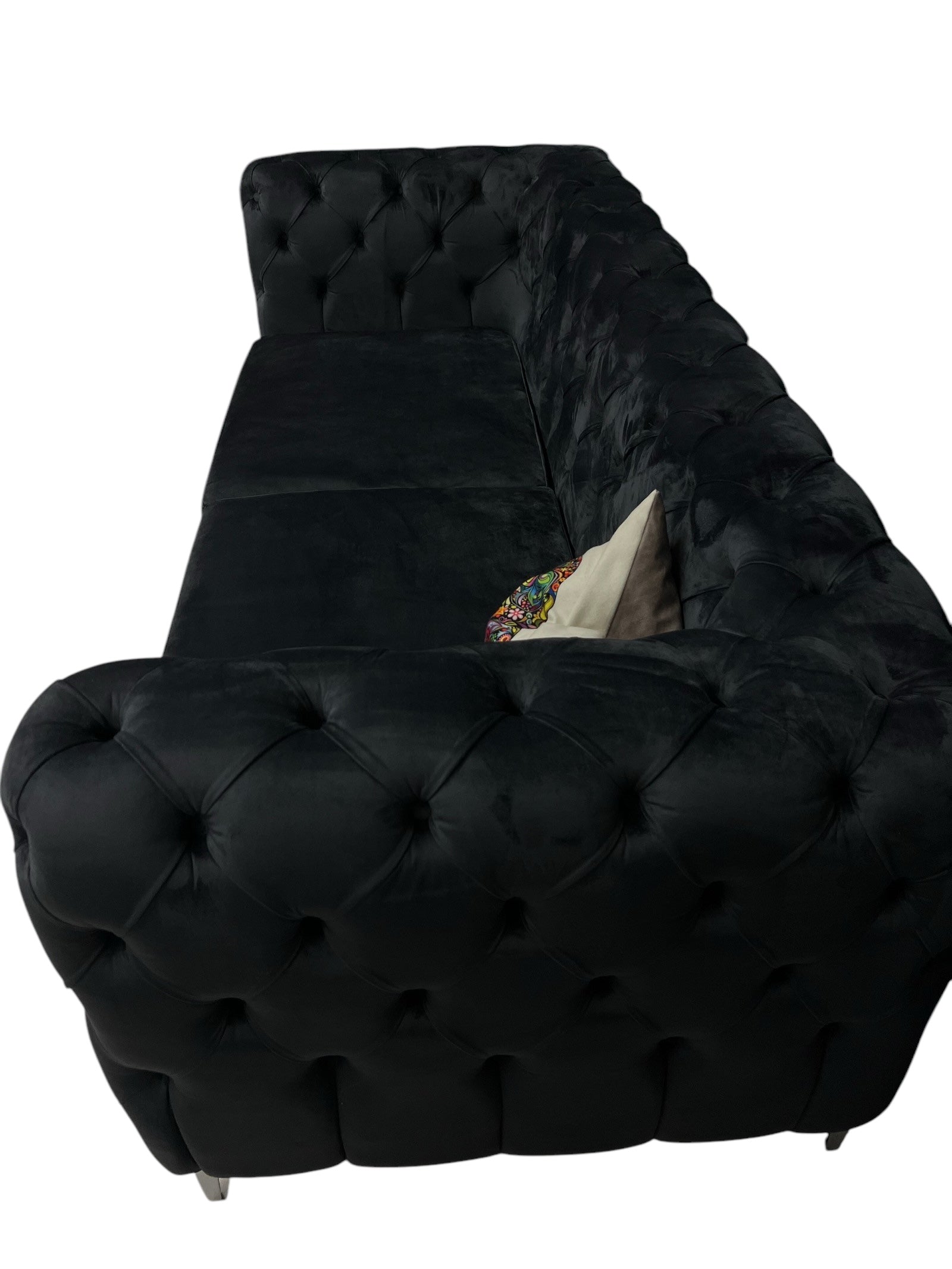 Helt ny, nydelig, modern, meget komfortabel, strøken, ubrukt, 3 seter chester design sofa i fin mørkblå/sortblå aktig farge fra Chili selges til en lav pris. Meget komfortable seteputter. Laget av slitesterk, hudvennlig og meget behagelig fløyel / velur stoff. På lager og klar for levering. Kan sendes over hele landet etter avtale.