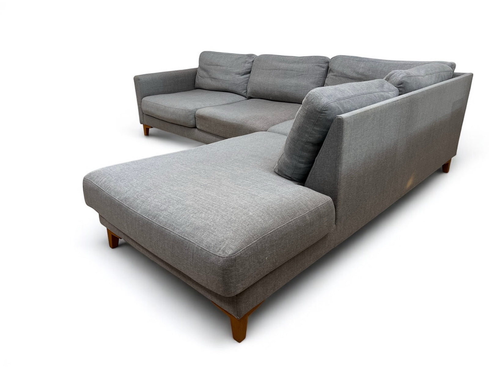 Fin, meget komfortabel, nyrenset, godt brukt design hjørnesofa med åpen ende til høyre sett forfra (sidene kan ikke vendes) i fin lysgrå aktig farge fra Bohus selges til en veldig lav pris. Meget komfortable sete og ryggputter. Den fremstår som helhetlig pen, med normale bruksslitasje, og tilbyr en behagelig middels fast til myk sittekomfort. Solfalmet på baksiden. Tilstanden av sofaen er vist så klart som mulig på bildene og video av varen.